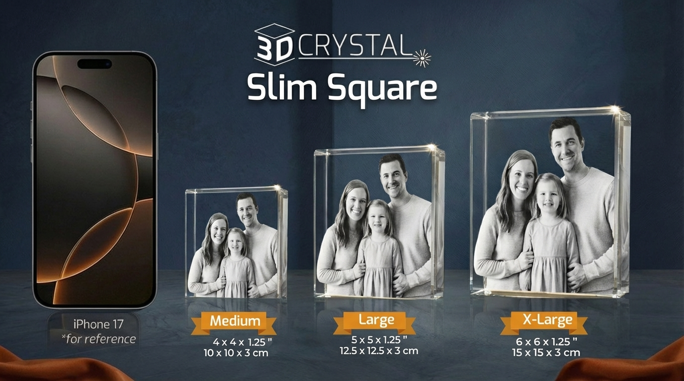 Celebrate your life’s milestones and special moments in a simple and elegant way with the 3D Crystal Slim Square. With its simple, slim design, the 3D Crystal Slim Square keeps the focus on your photo, allowing it to stand out naturally. It fits easily into any home or office space, making it ideal for smaller areas such as desks, shelves, or bedside tables, so you can keep a meaningful moment close to you. The crystal is available in different sizes, allowing you to choose the one that best fits your photo and needs. You may also add engraved text for a more personal touch, along with an optional light base to bring your photo to life and enhance the overall experience.